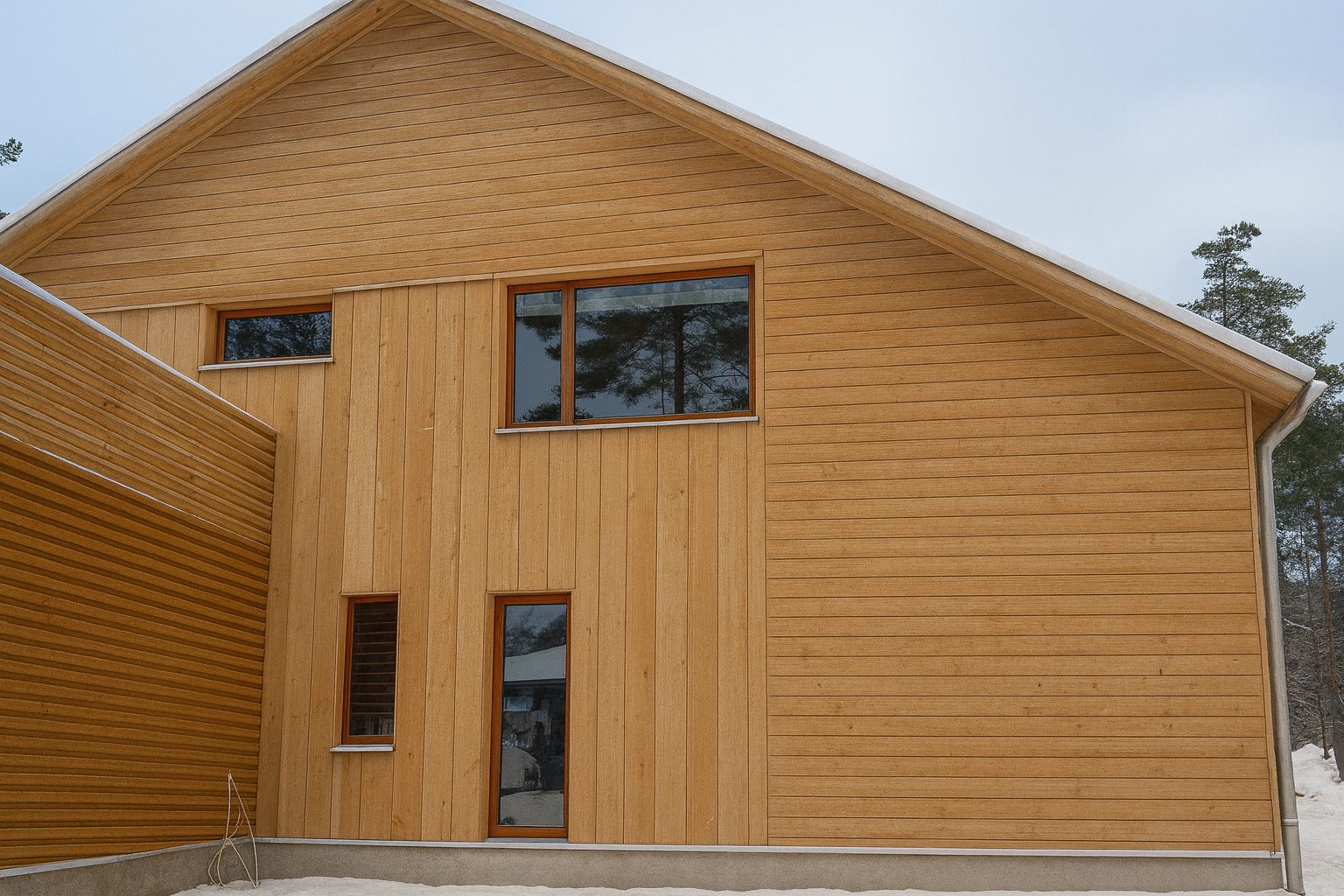 Вагонка применяется для обшивки фасадов домов, бань, беседок и других построек. Она защищает стены от воздействия окружающей среды и придаёт зданию завершённый вид.